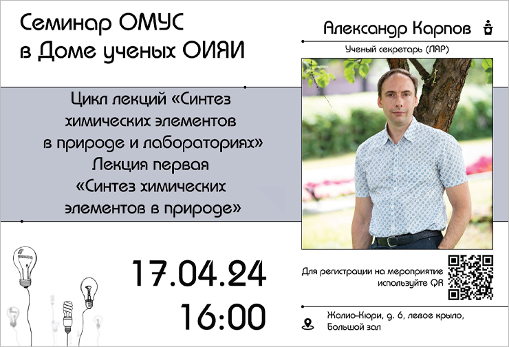 Ученый секретарь ЛЯР ОИЯИ Александр Карпов выступит с лекцией «Синтез химических элементов в природе». Это первая лекция из серии «Синтез химических элементов в природе и лабораториях».
