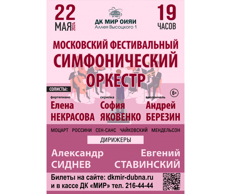22 мая 2024 г. в 19:00 Дом культуры «Мир» ОИЯИ приглашает на концерт Московского фестивального симфонического оркестра.